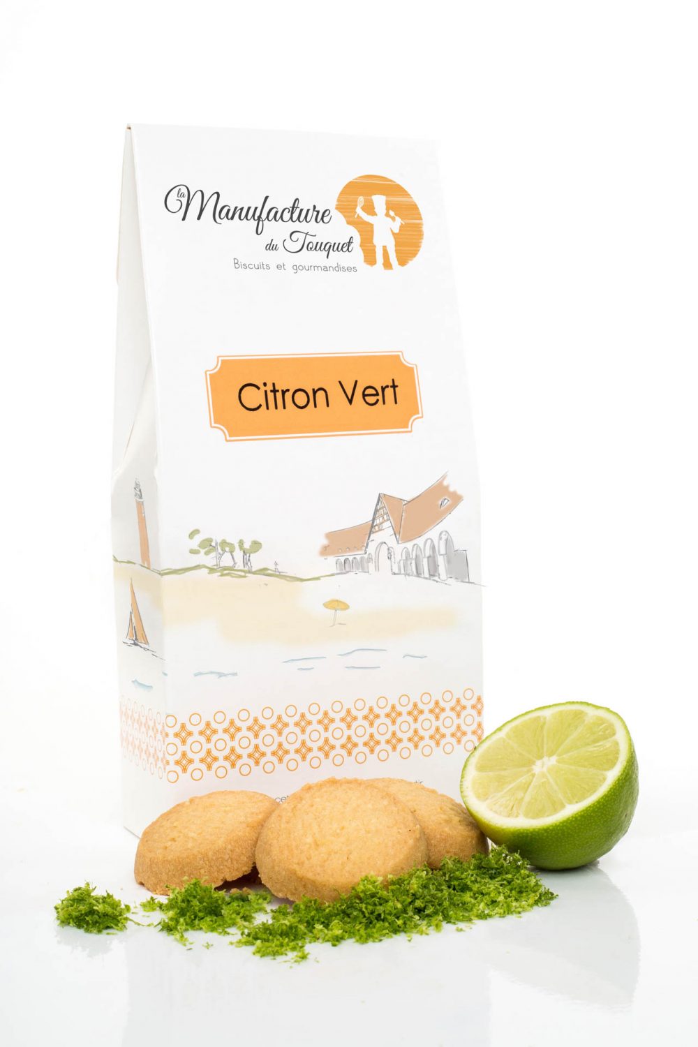 Farine de BLÉ des Moulins de Campagne, beurre(LAIT), sucre glace, sucre, AMANDES, jaunes d’OEUFS, zeste de citron vert(min. 0,7%) sélectionné par Touquet Fruit, miel de Cavillon(80), bicarbonate, sel de Guérande, arôme naturel de citron vert(min.0,01%).